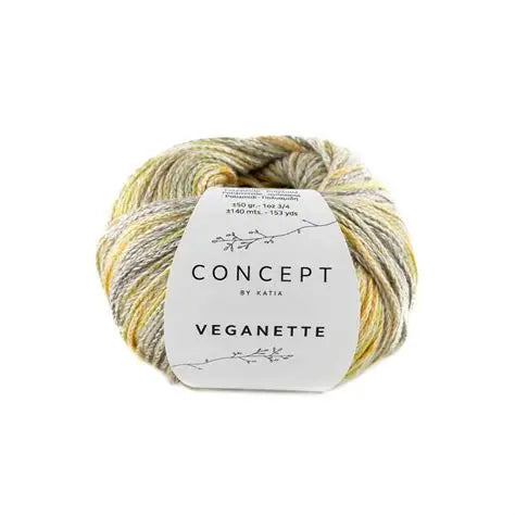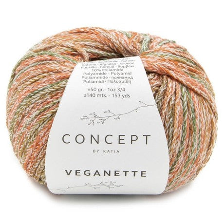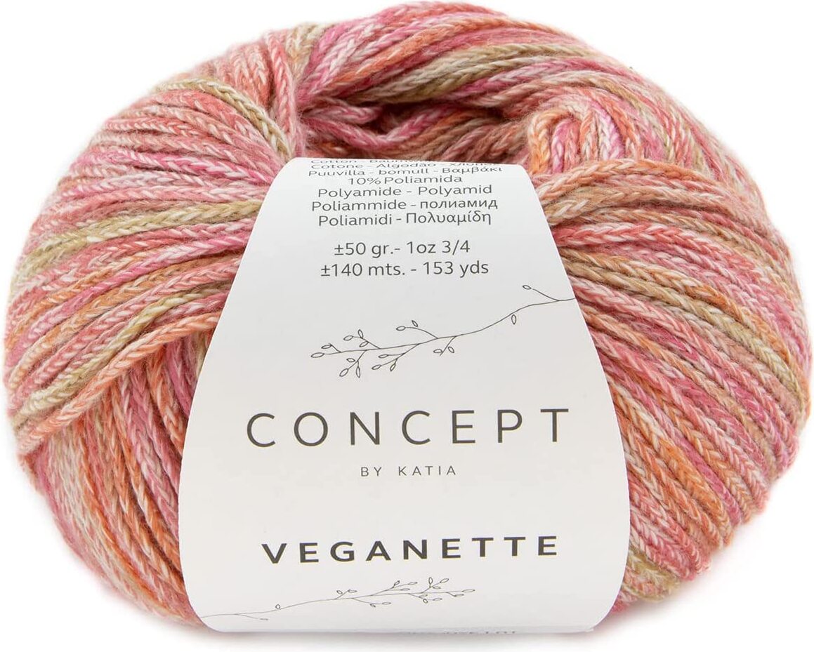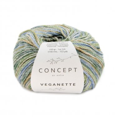Katia Veganette - A wonderfully soft yarn made from cotton and polyamide. The braided thread consists out of several colors and is suitable for knitting and crochet. A small colorful color palette with which you can crochet or knit beautiful cardigans, sweaters and children's clothing. In addition to clothing, it is nice to make a wrap or hat with this yarn.