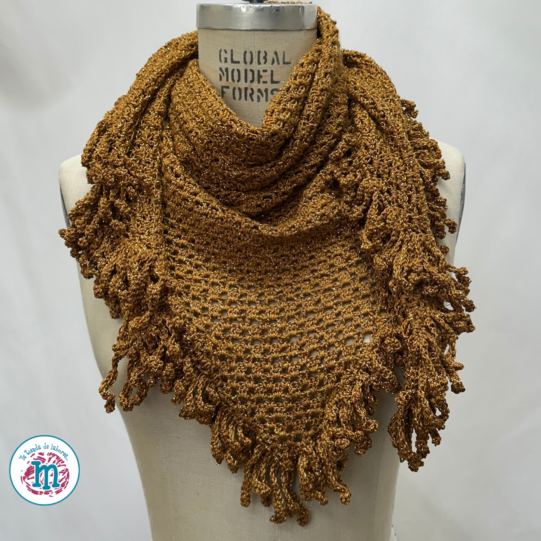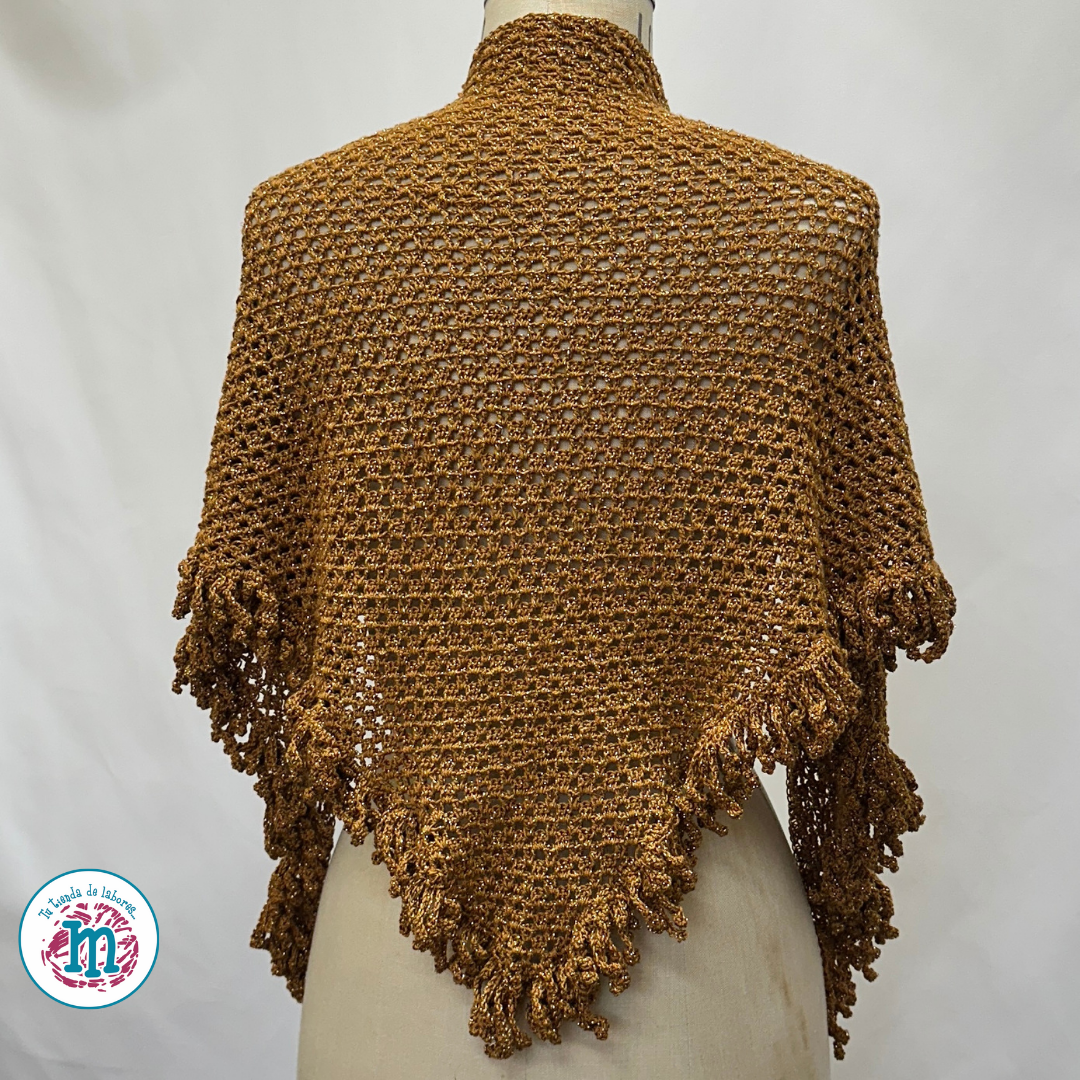La Estolita Madejas es una estola triangular ligera, elegante y llena de movimiento. Se trabaja alternando filas de V Stitches y nuestros característicos arbolitos (granny stitch), que aportan textura, cuerpo y un diseño visualmente hermoso.